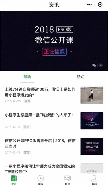 小程序功能升级--诸暨云远科技“ 为了帮助用户更便捷地使用小程序,微信在主界面新增了小程序任务栏的功能。小程序菜单进行了升级,并提供小程序间快速切换的功能。同时,我们开放了小游戏开发文档和开发者工具。” 01 — 新增小程序任务栏功能 为了让用户更便捷地启动和使用小程序,微信在最新版6.6.1的主界面中,增加了小程序任务栏。用户可以通过下拉的动作,唤出任务栏,打开最近使用过的小程序或进入小程序历史列表。 (通过任务栏打开最近使用的小程序) 02 — 小程序菜单升级,并支持小程序间快捷切换 小程序菜单进行了升级,在原来的 “···” 按钮的右侧,增加了 “圆点” 按钮。 原有的 “···” 按钮功能保持不变,点击 “圆点” 按钮可以离开当前的小程序。 (小程序菜单操作) 长按 “圆点” 按钮可以唤出多任务切换界面,快捷地打开最近使用过的小程序。 (长按 “圆点” 切换小程序) 后续将陆续开放自定义导航条的能力,将屏幕更多区域交给开发者来实现。 03 — 小游戏开发支持 小游戏已于今日正式上线。游戏开发者可以在微信公众平台上查阅小游戏开发文档,下载最新版的开发者工具。 |